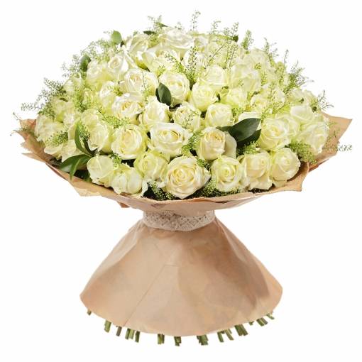 Большой букет означает желание доставить удовольствие и произвести хорошее впечатление. Цветочная композиция из более сотни белых роз на ножке длиной 70 см запомнится навсегда адресату. Цветы обозначают нежность, свет и чистоту намерений, отлично подойдут в качестве подарка на свадьбу, извинения перед членами семьи или любимой женщиной, или в виде жеста внимания, обеспечивающего шквал положительных эмоций. Даже если вы не надеетесь на благодарность – после такого букета вы точно ее получите.